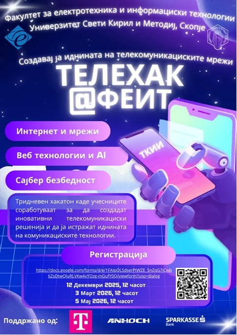 Факултетот за електротехника и информациски технологии (ФЕИТ) при Универзитетот „Св. Кирил и Методиј“ во Скопје со гордост го најавува ден 3 (финале) на ТЕЛЕХАК@ФЕИТ– првиот хакатон посветен на телекомуникациите, наменет за ученици од четврта година од сите средни училишта во Македонија.