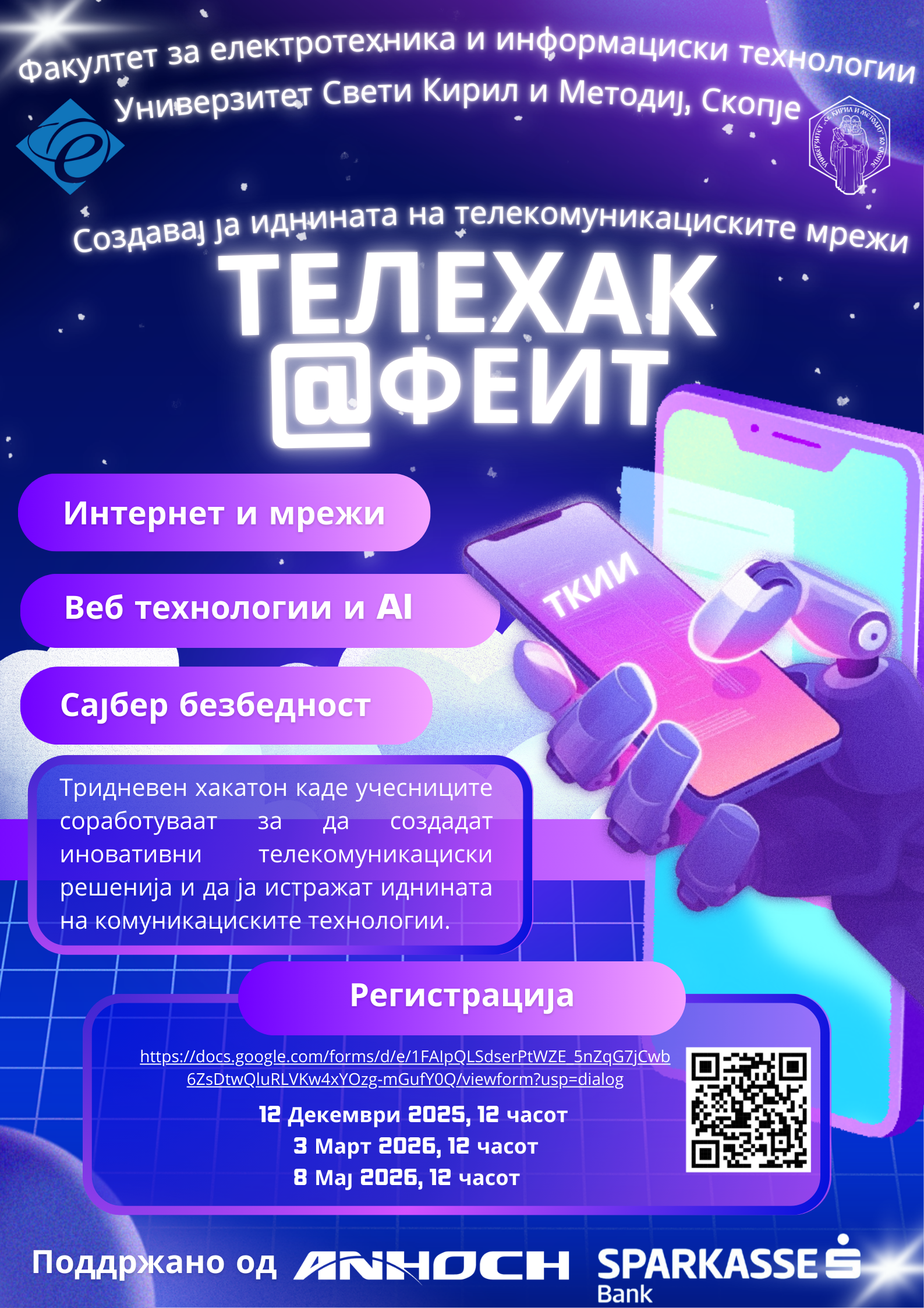 Факултетот за електротехника и информациски технологии при Универзитетот „Св. Кирил и Методиј“ во Скопје со гордост го најавува ден 2 на ТЕЛЕХАК@ФЕИТ– првиот хакатон посветен на телекомуникациите, наменет за ученици од четврта година од сите средни училишта во Македонија.
